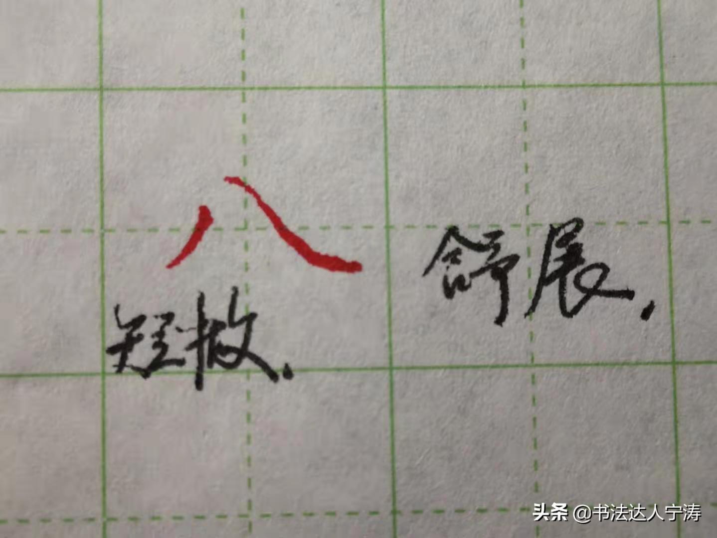 八字,整个短撇跟斜捺的起笔位置在一条线上,撇和捺不在是撇低捺高了,而是在同一水平位置上。
