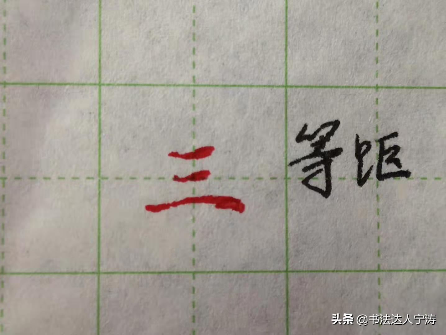 三字,除了三横横画等距外,还要注意中间的短横稍短一点,按顺序排列是,中间是短横,首横是中横,末笔是长横,书写应注意长短变化。