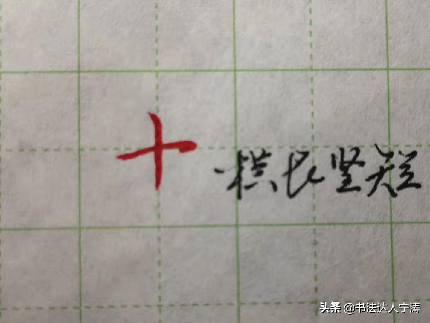 十字,横长竖短,长横穿插竖画的中间位置,但竖画则要在横画的中间位置略往右点起笔。