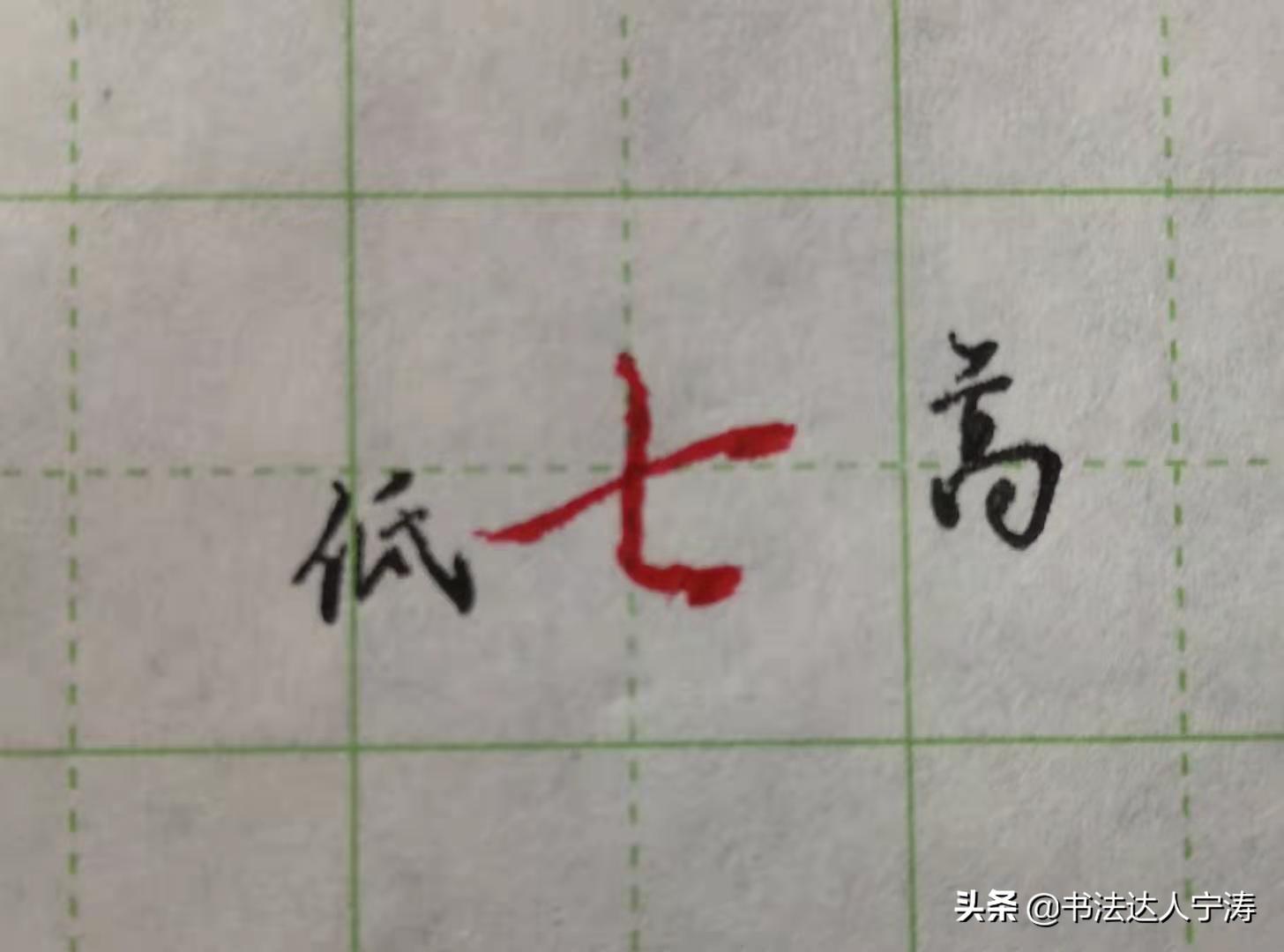七字,这个字有点特殊,长横要比其他带长横的字的扛肩要大,找到这个特点,七字就容易写好了,中间的竖弯钩在长横的中间位置。