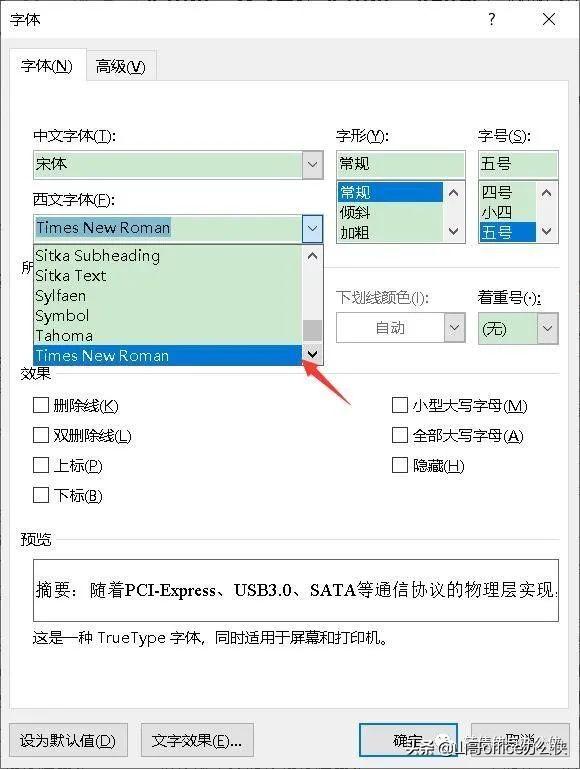 因为这段文字中的英文字体很混乱,有不同的字体,所以在“西文字体"的下拉框中并没有显示它的字体类别。这个我们无需理会,因为它并不妨碍我们下一步的操作。我们点击下拉框的下拉箭头,按照论文排版要求下拉找到”Times New Roman“字体,在下拉列表靠近最下的位置(因为是按字母顺序升序排列的),点选它。