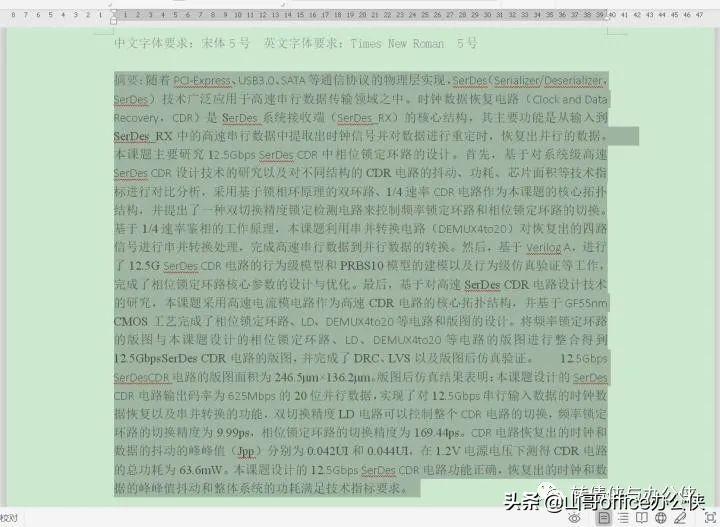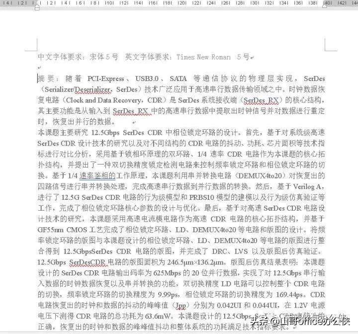 那么我们正式开始。比如下图,就是一份论文的摘要,这份论文的摘要里面既有中文字体,又有英文字体。一般的论文排版要求,对于中文字体是要求使用宋体5号字,而对于英文字体,是要求使用Times New Roman的5号字。可能各家期刊略有不同,但这个是办公侠见过最普遍的,一般的毕业学位论文都是这样规定的。