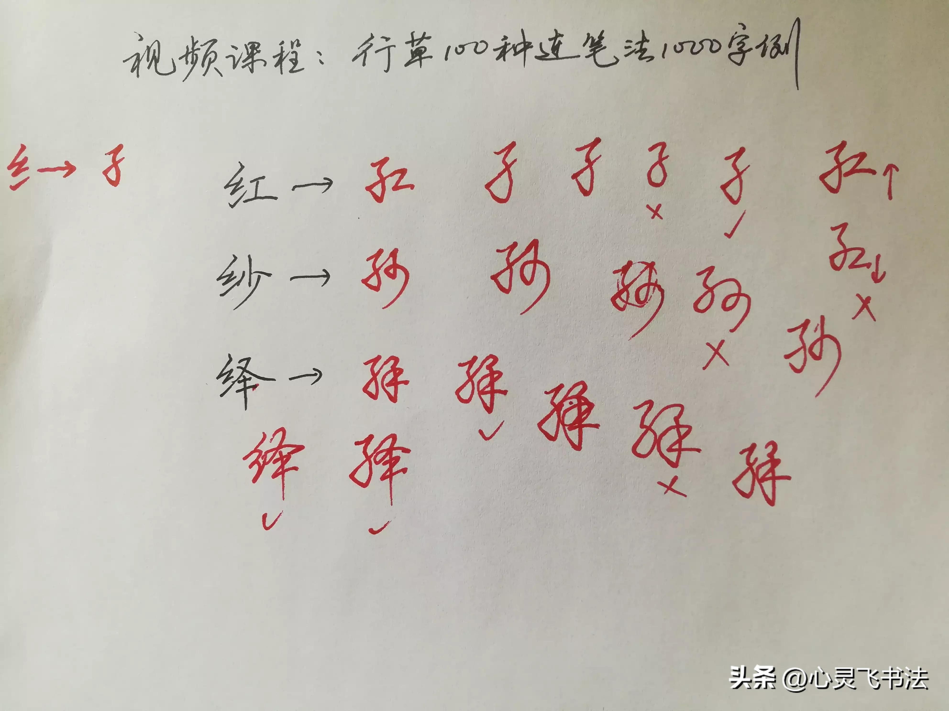 再来看一组,“红、纱、绎”,都有绞丝旁,楷书的绞丝旁都知道怎么写,但是到了行草字体,绞丝旁可以变形,简化成如图所示的样子。如果不是放在一个字之中,想必很多人不认识这种写法的绞丝旁。
