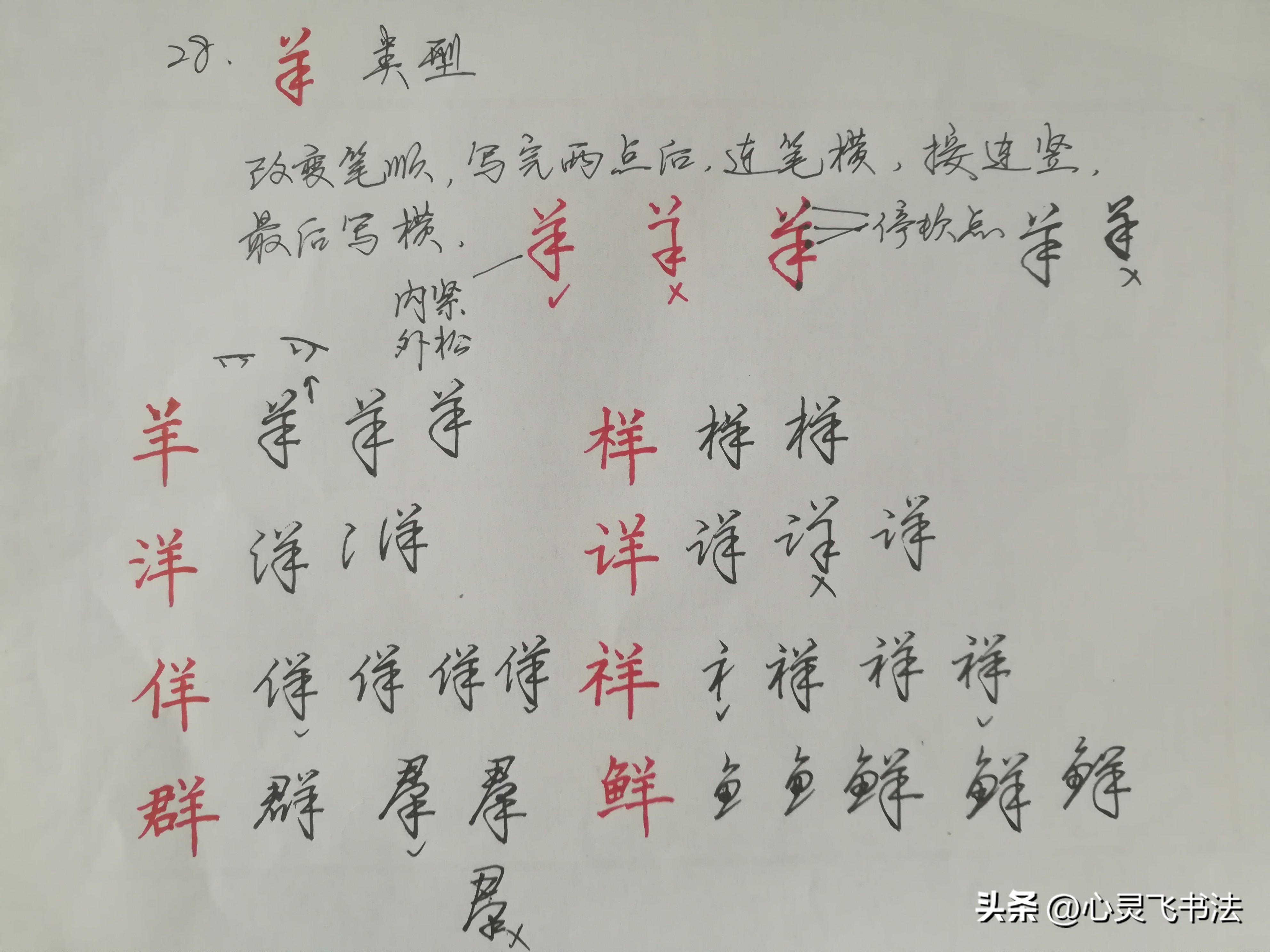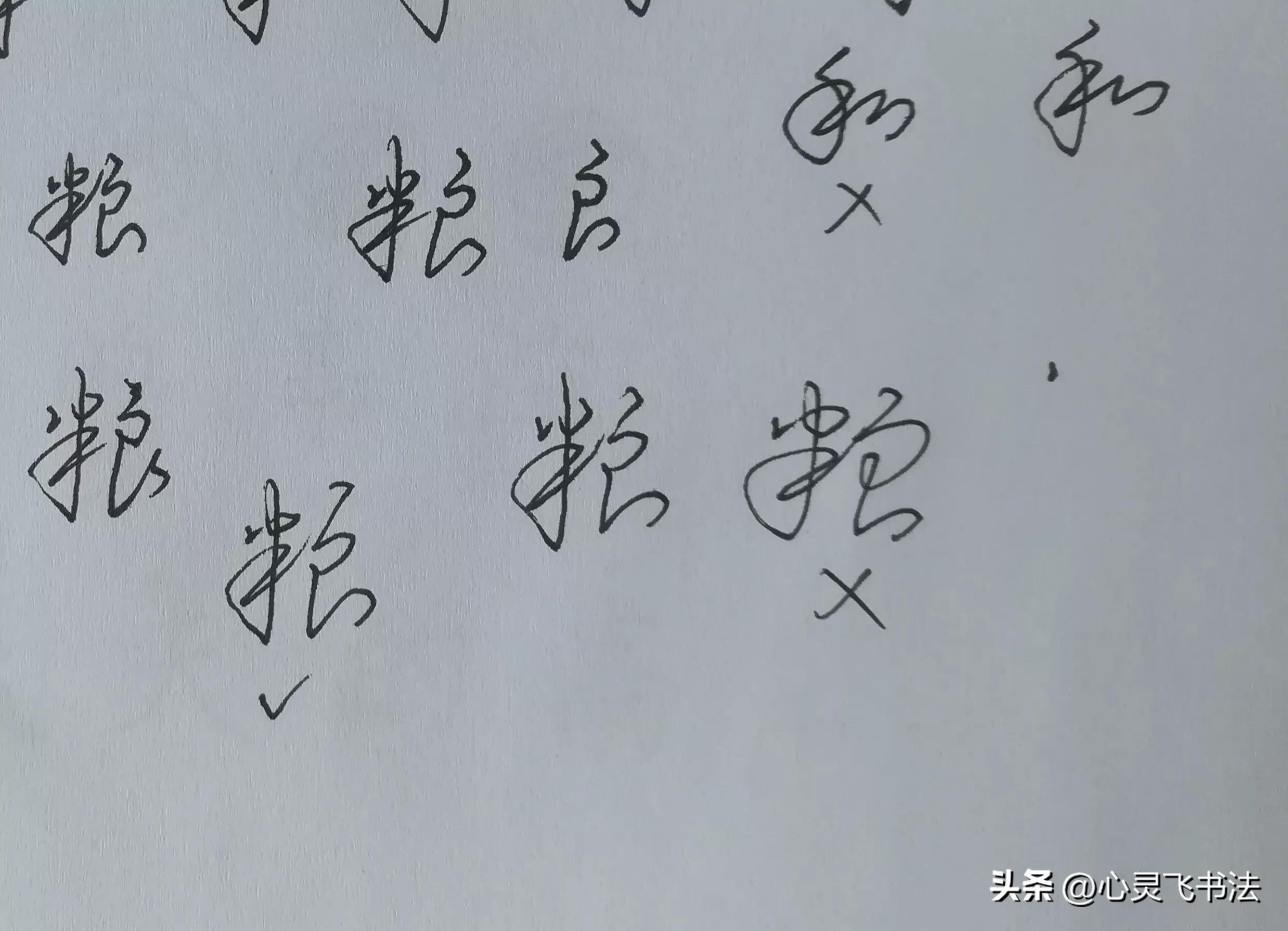 “粮”字,打错号的主要是没有把“结构”安排好,看起来散乱不紧凑,正确写法是要让字的内部空间变小,外部空间变大,形成“内紧外松”的结构才好看。所以,要写成打对号的结构类型才好看才精神。