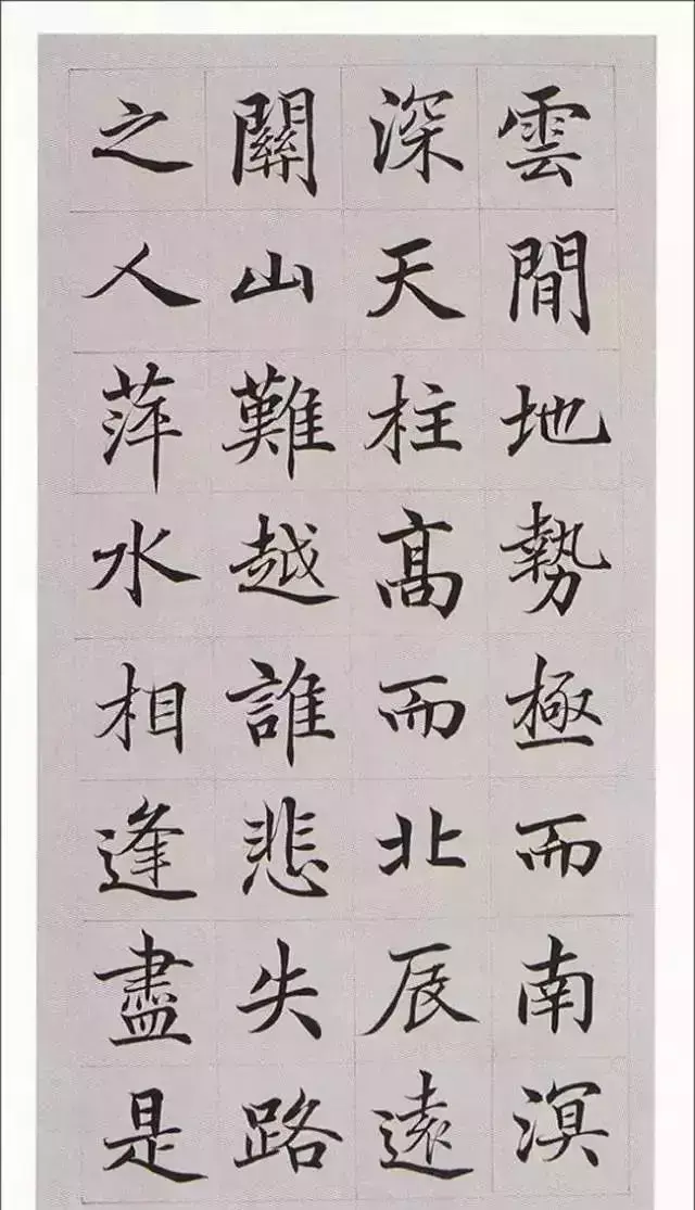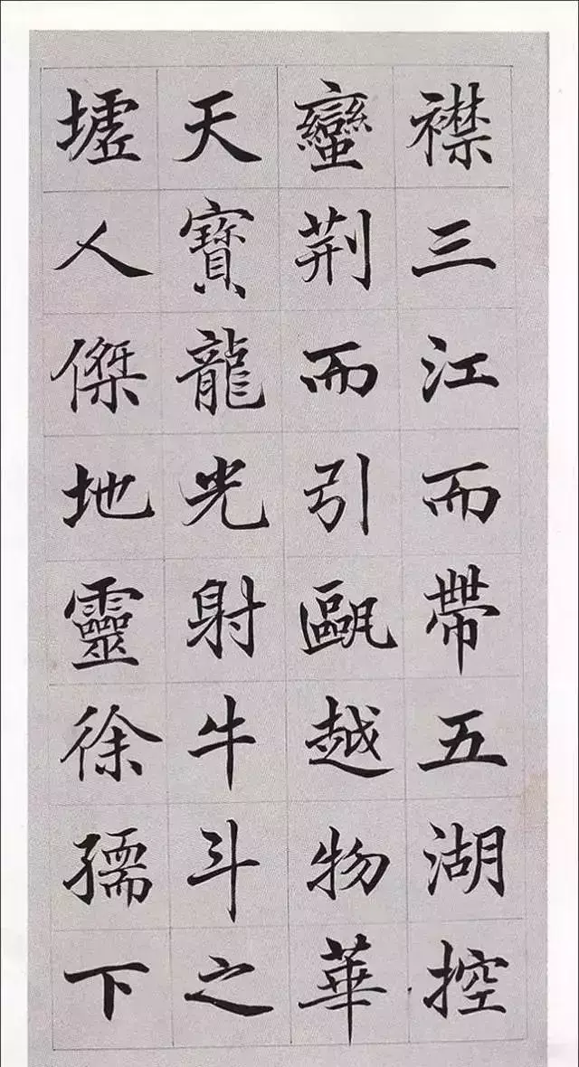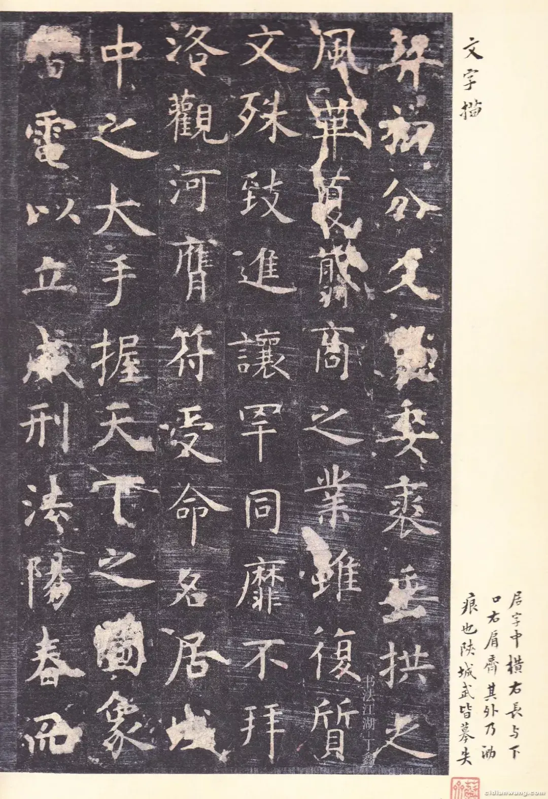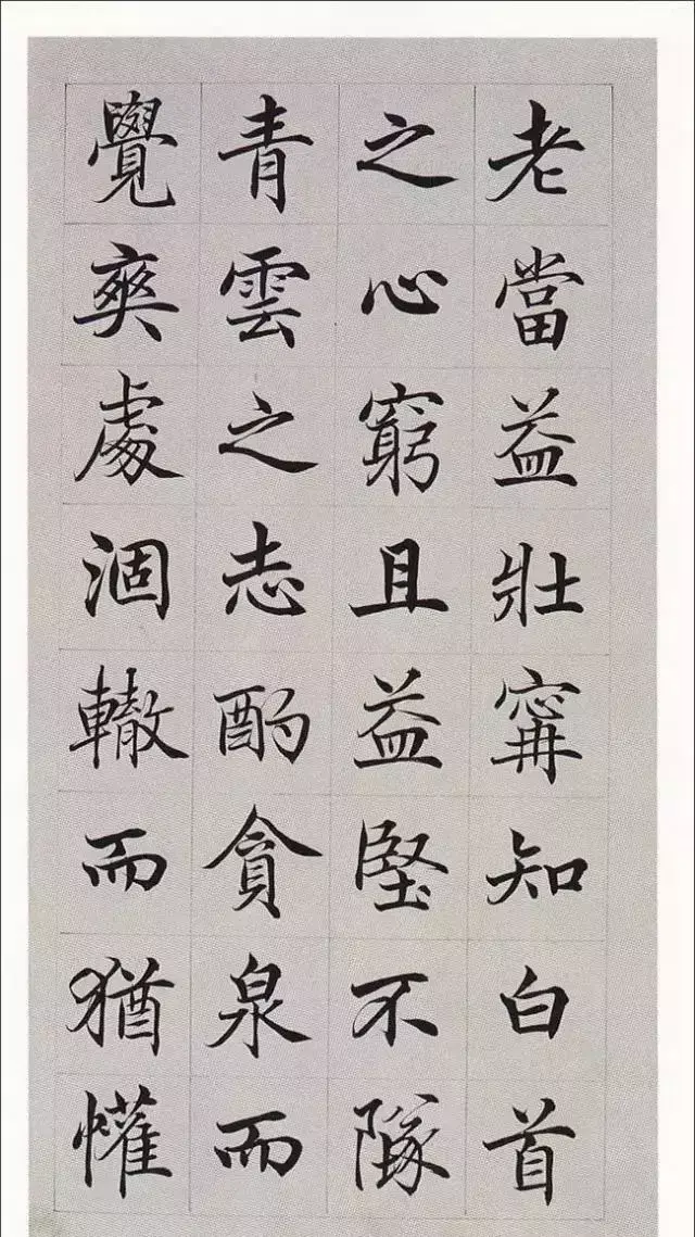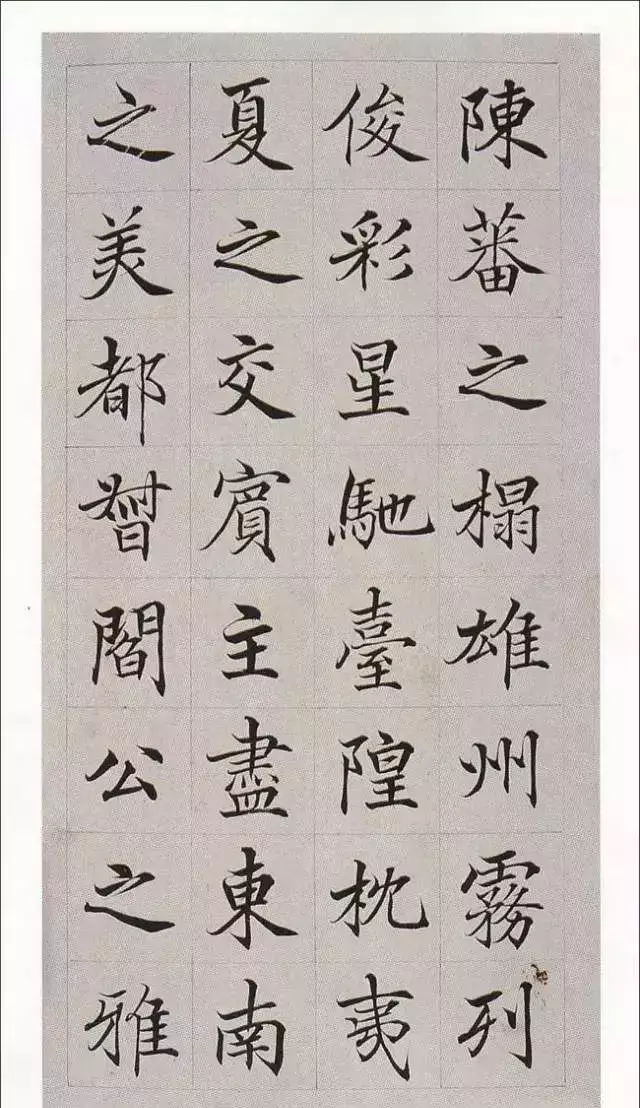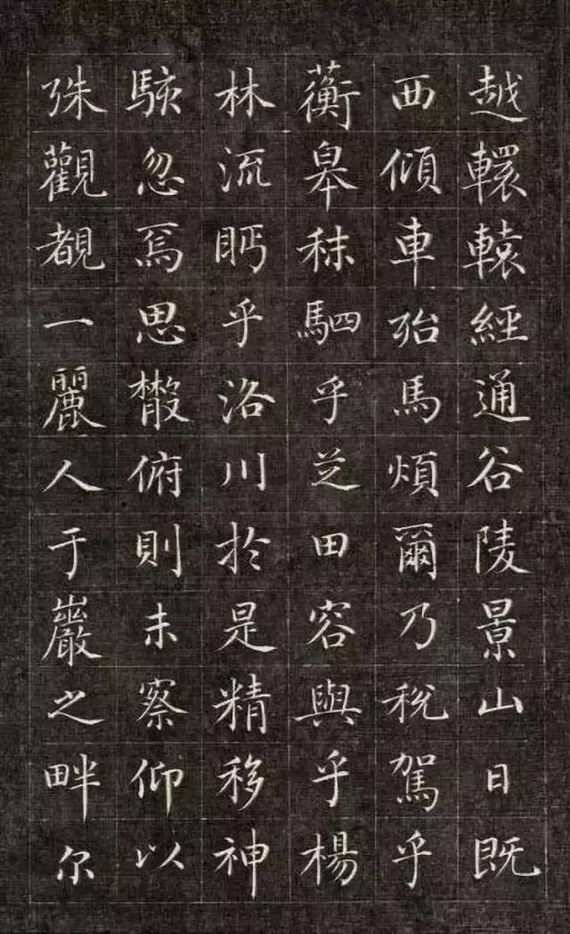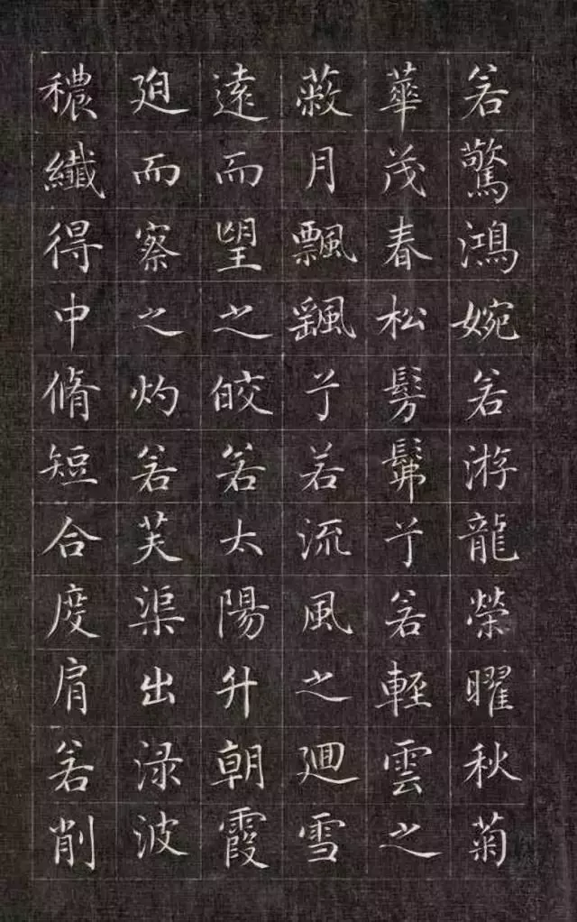 此作结体修长,中宫收紧,四边开张,左敛右纵,化险为夷。字形随势赋形,左右结构作相背之势,上下结构上窄下宽,间架开阔稳定,气象庄严。其布白匀整,字距、行距疏朗,为九宫最准者,全碑血脉畅通,气韵萧然。