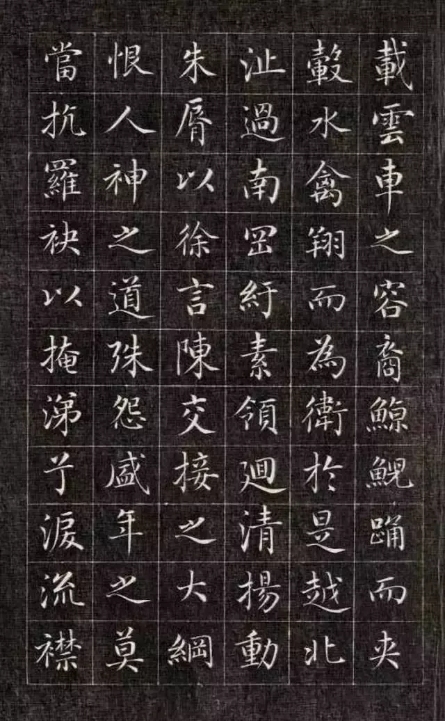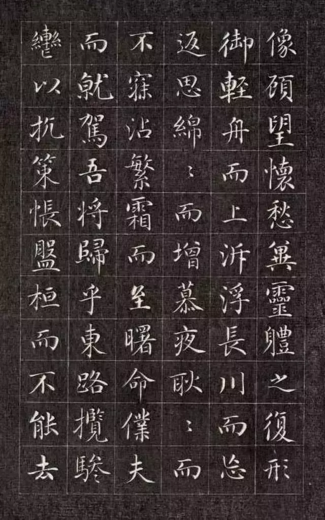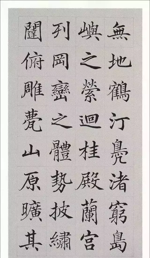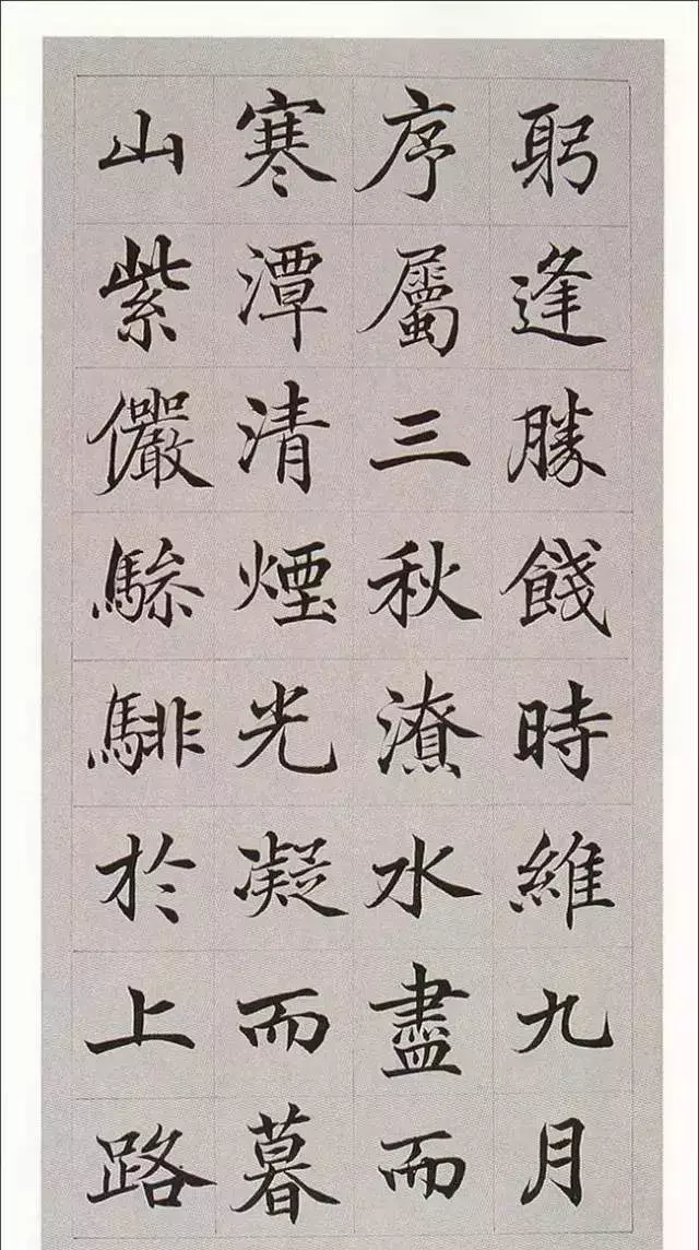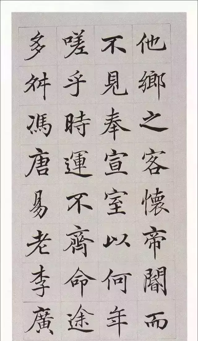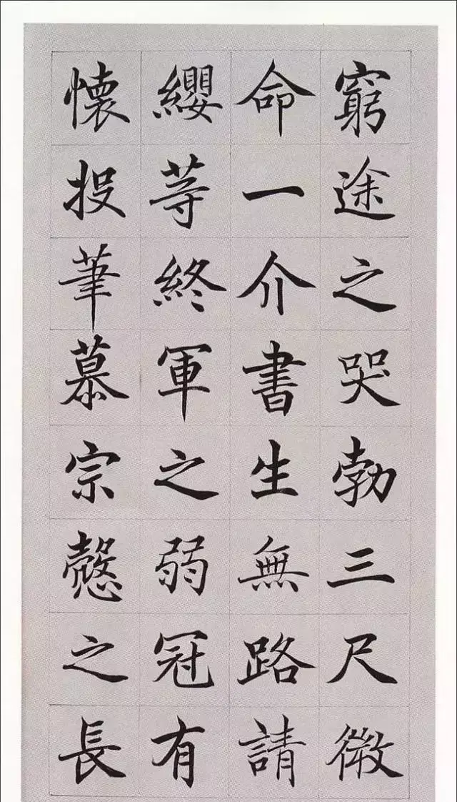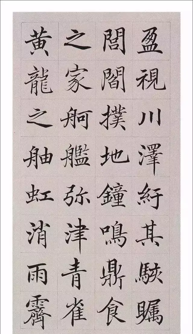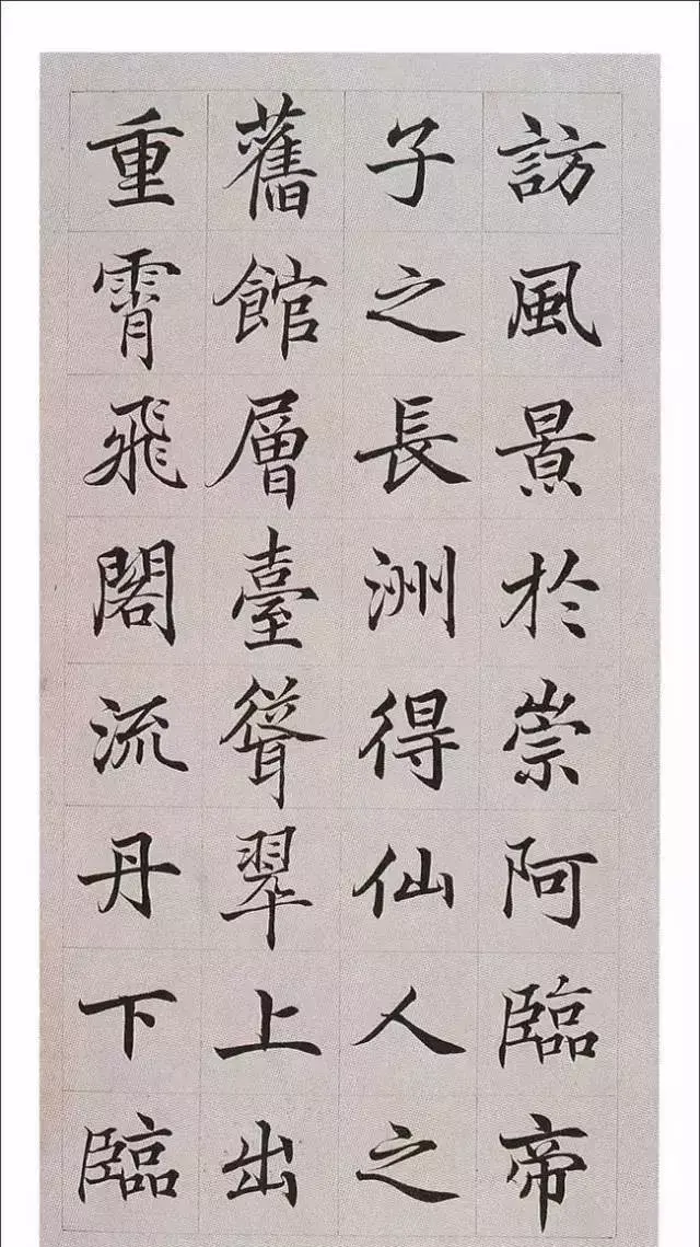 此作结体修长,中宫收紧,四边开张,左敛右纵,化险为夷。字形随势赋形,左右结构作相背之势,上下结构上窄下宽,间架开阔稳定,气象庄严。其布白匀整,字距、行距疏朗,为九宫最准者,全碑血脉畅通,气韵萧然。