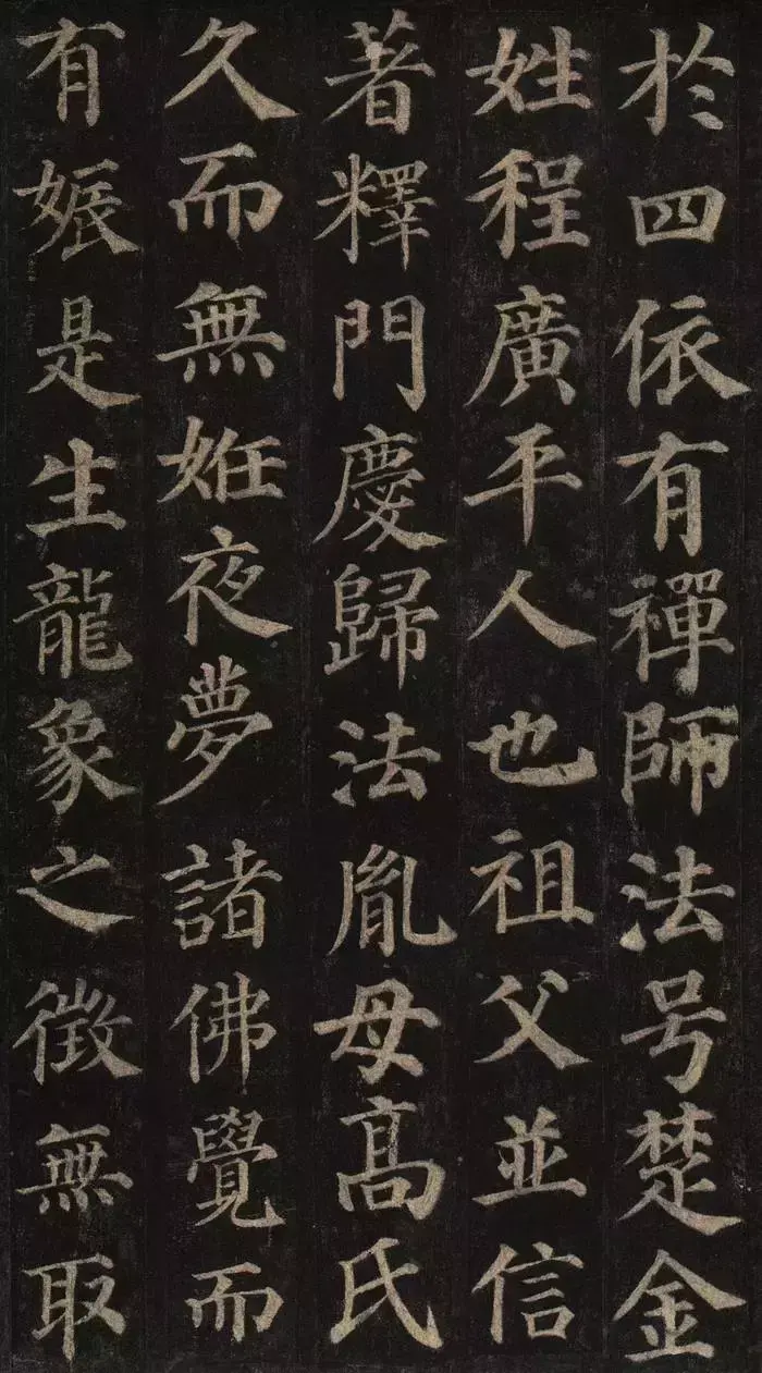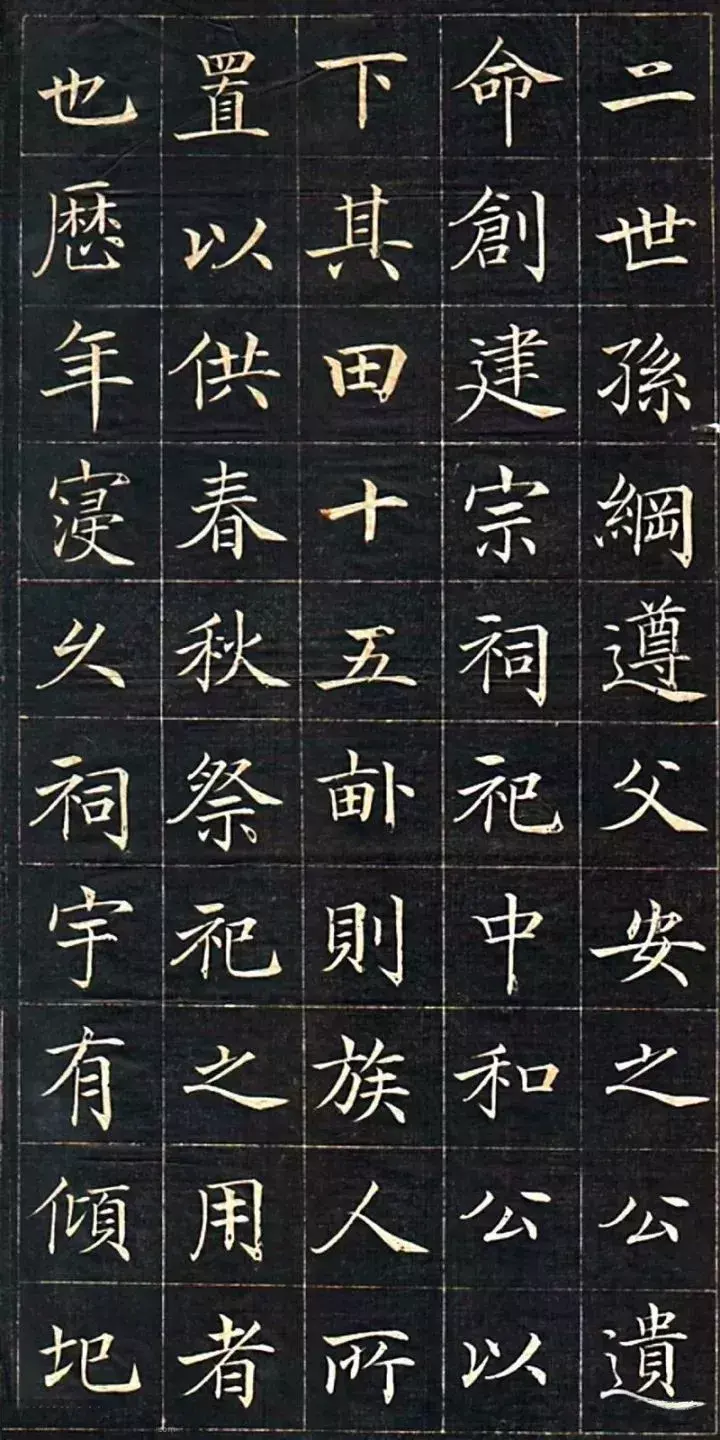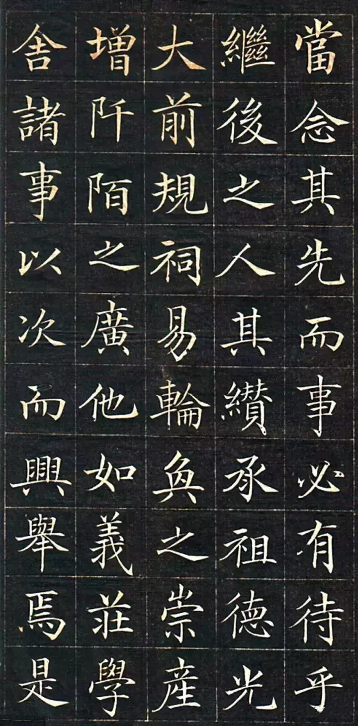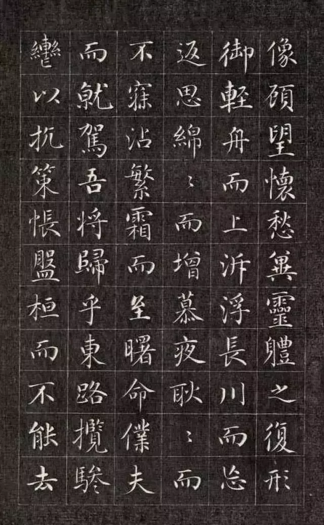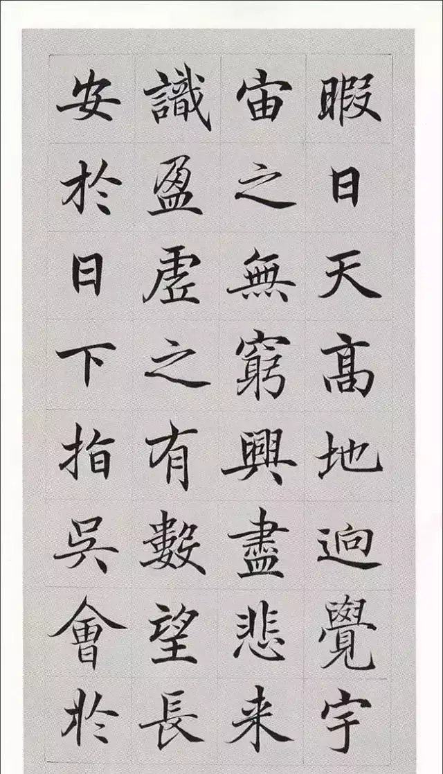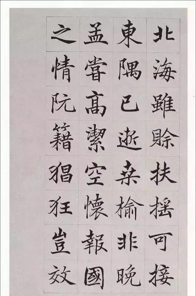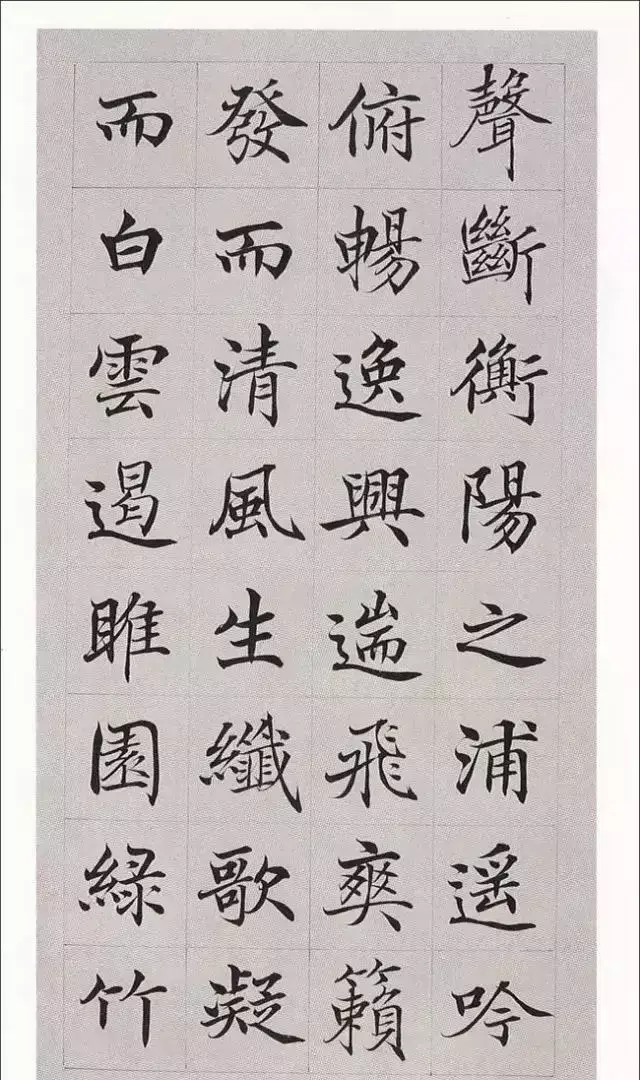 此作结体修长,中宫收紧,四边开张,左敛右纵,化险为夷。字形随势赋形,左右结构作相背之势,上下结构上窄下宽,间架开阔稳定,气象庄严。其布白匀整,字距、行距疏朗,为九宫最准者,全碑血脉畅通,气韵萧然。