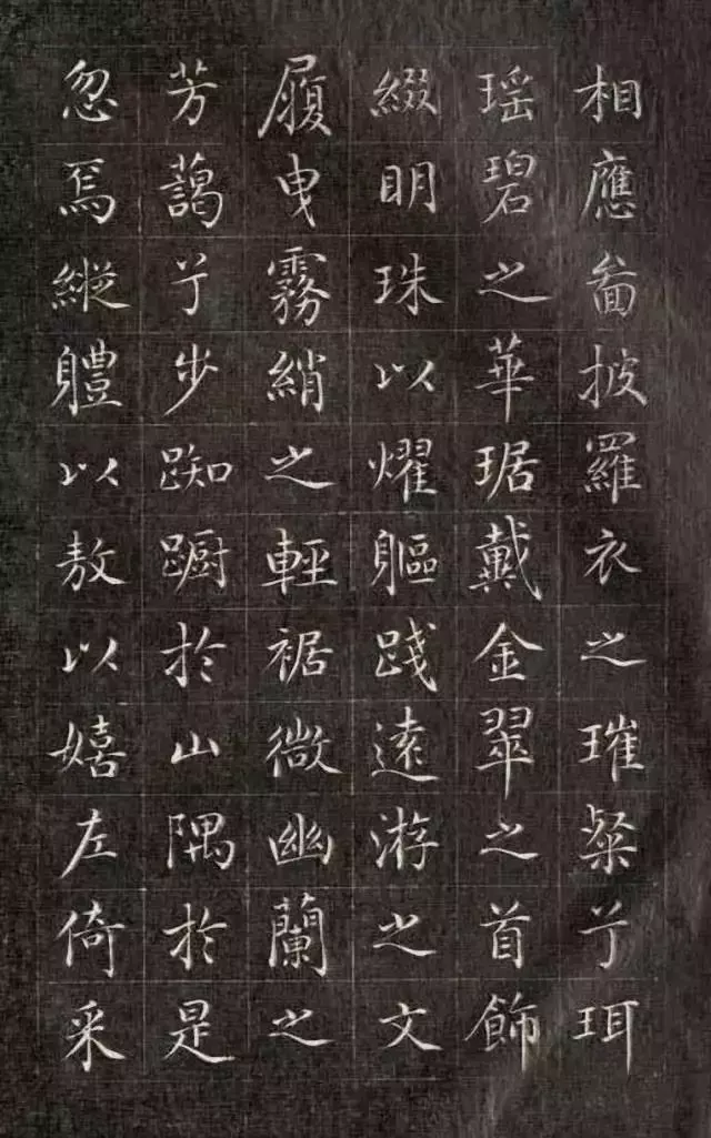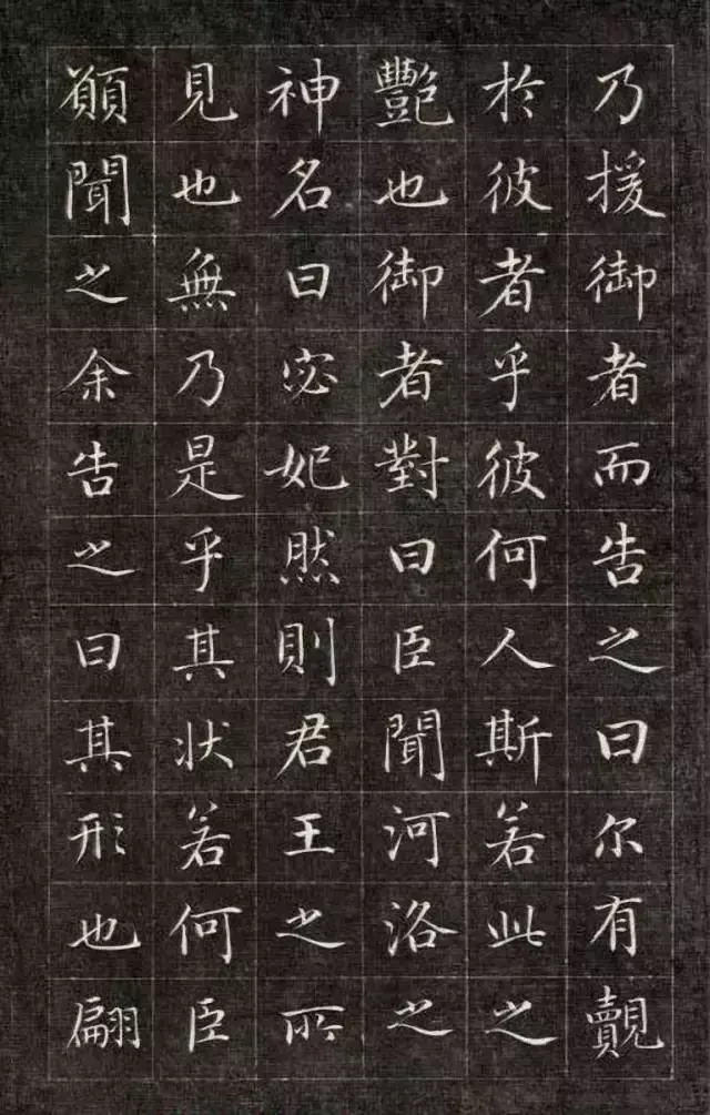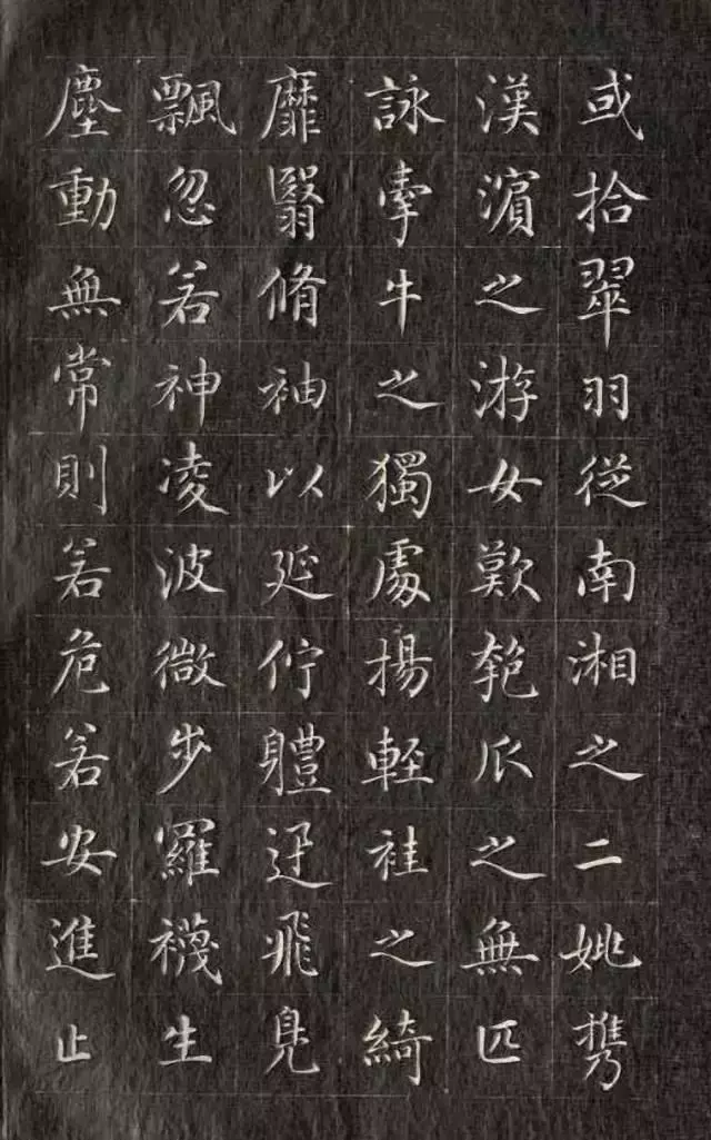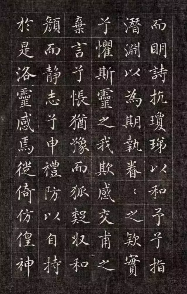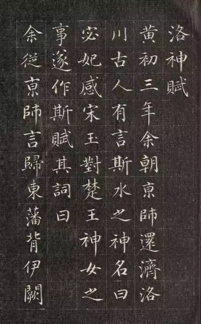 《洛神赋》是东晋王献之楷书代表作,原墨迹写在麻笺上,内容为三国著名文学家曹植著名文章《洛神赋》。此作王献之用笔挺拔有力,风格秀美,结体宽敞舒展。字中的撇捺等笔画 往往伸展得很长但并不轻浮,笔力运送笔画末端,遒劲有力,神采飞扬。字体匀称和谐,各部分的组合中又有细微生动的变化,字的大小不同,字距、行距变化自然。