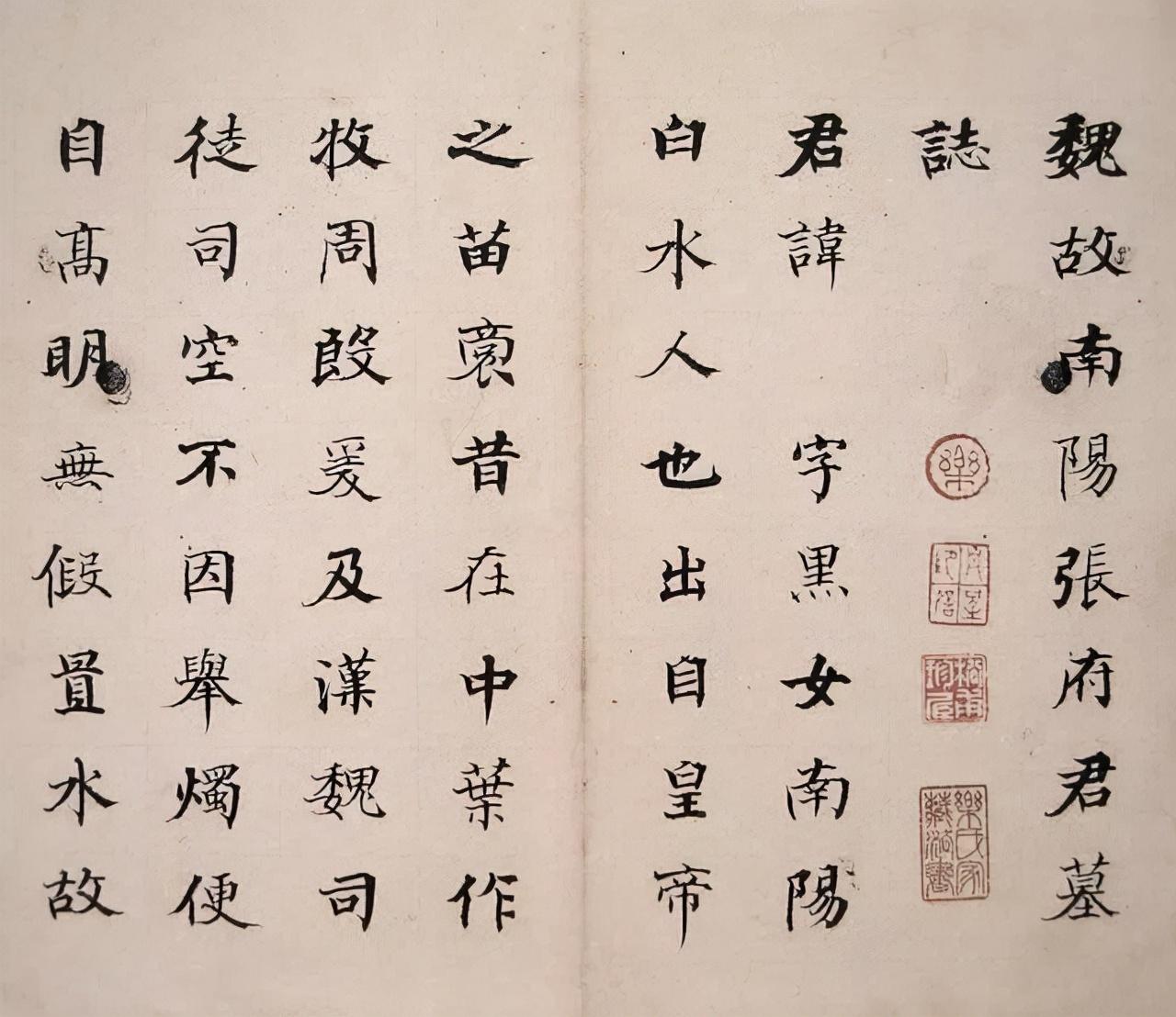 何绍基,清代著名大书法家,一生豪饮健游,多历名山胜地,拓碑访古,吟诗挥书,且以书法著作自娱,自成一家,被誉为“清代第一”。尤其临《张黑女》,堪称典范级。《张》本就精美遒古,峻宕朴茂,古质典雅,多出隶意。何绍基在跋语中赞曰:“化篆分入楷,遂尔无种不妙,无妙不臻。然遒厚精古,未有可比肩 〈黑女〉者。”何绍基习书用功过人,临写益多,尤以《张黑女墓志》用功最勤,不求形似,但出己意,所临《张黑女》俨然己意,尤为出色。