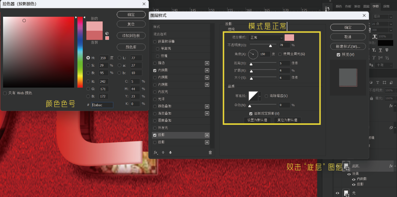 21.双击“底层”,调出 “图层样式”,添加一个“投影”,“投影”颜色选择一点的粉红色(f2abac)。“投影”的混合模式选择“正常”,不透明度:78%,角度:150度,关闭全局光,距离:5像素,阻塞:6%,大小:6像素,品质杂色:0%。