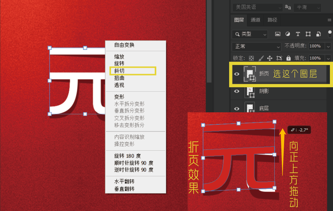 11. 选择“折页”,键盘Ctrl+T,点击“鼠标右键”进行自由变换,选择“斜切”,然后按住“鼠标左键”向正上方拖动,然后键盘按Enter确定。