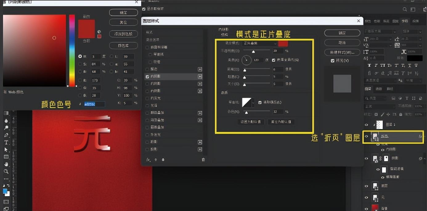 18.双击“折页”,调出“图层样式”,添加一个“内阴影”,“内阴影”的颜色(ad231c)需要比背景颜色暗。“内阴影”的混合模式选择“正片叠底”,不透明度:39%,角度:120度,使用全局光,距离:6像素,阻塞:5%,大小:5像素,品质杂色:12%。