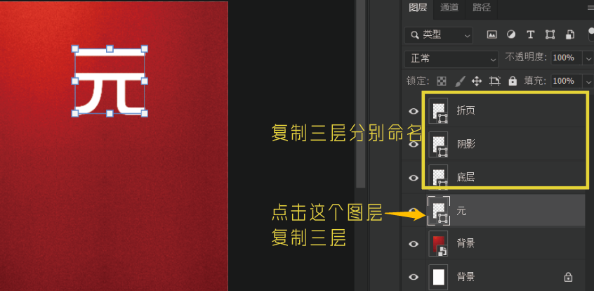 6. 选中“元”,CTRL+J 复制三层,然后把新复制的图层分别命名为底层/阴影/折页。