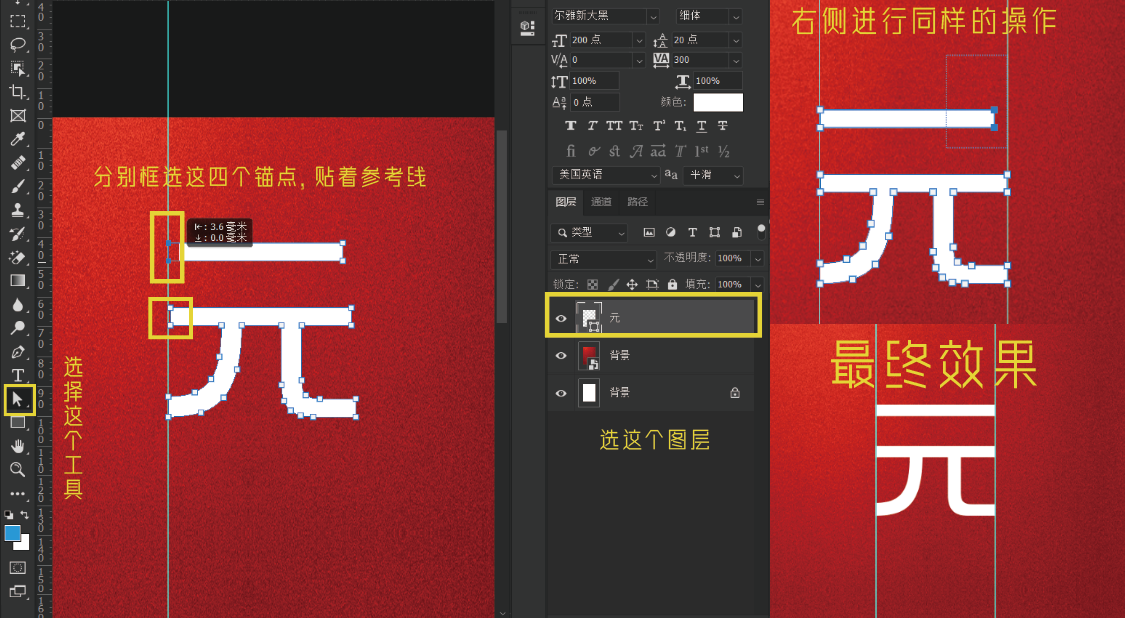 5. 选择“元”图层,点击“直接选择工具”,按住“鼠标左键”框选“元”左侧需要移动的锚点,贴齐参考线,右侧进行同样操作,先拉“参考线”再贴齐锚点。