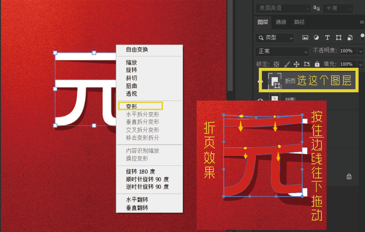 13. 选择“折页”,键盘Ctrl+T,鼠标右键进行自由变换-选择“变形”,然后按住“鼠标左键”向下方轻轻拖动,看到折页有一些自然弧度后,可以键盘按Enter确定。