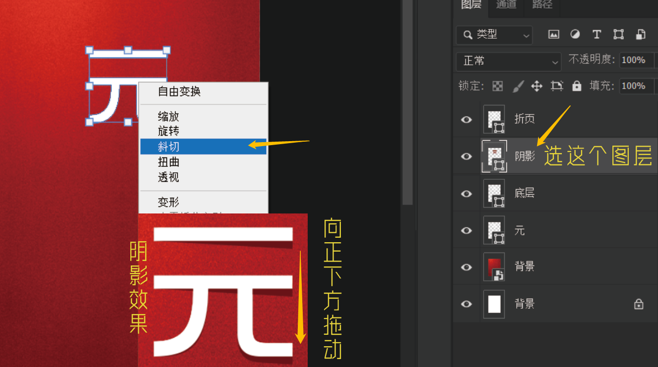 8. 选择“阴影”,键盘Ctrl+T,鼠标右键进行自由变换,选择“斜切”,然后按住“鼠标左键”向正下拖动,可以看到阴影出现了,然后键盘按Enter确定。