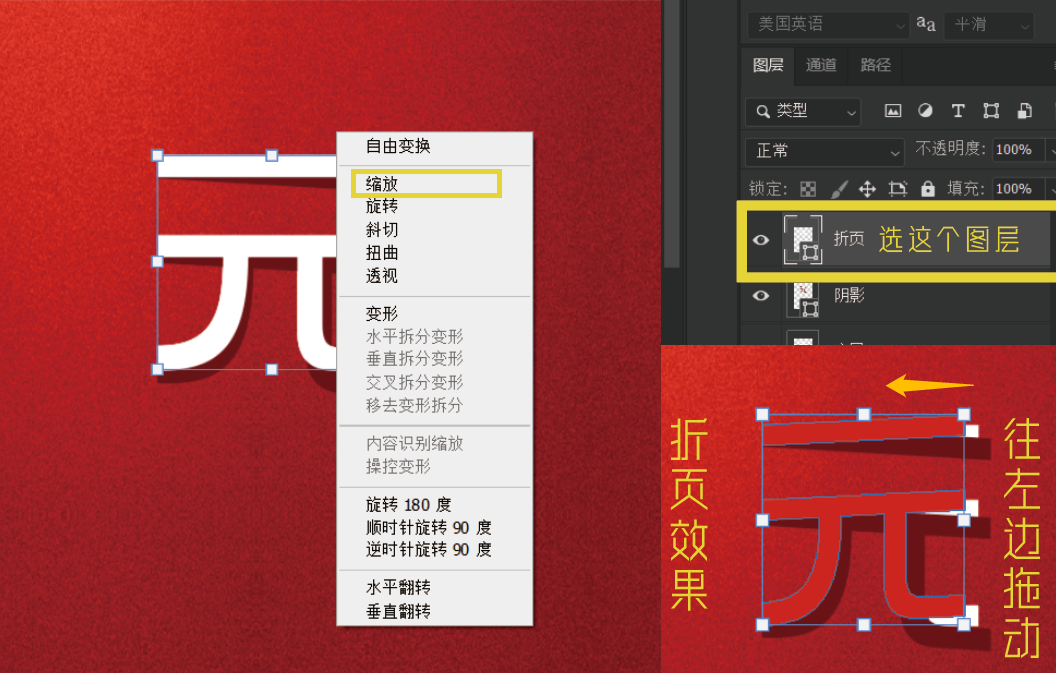 12. 选择“折页”,键盘Ctrl+T,鼠标右键进行自由变换-选择“缩放”,然后按住“鼠标左键”向左侧拖动(拖动时要按住shift键),可以看到折页移动后,然后键盘按Enter确定