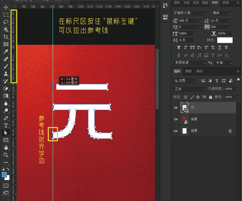4.从左边的“标尺”拉出一条参考线对齐“元”左侧的字边。