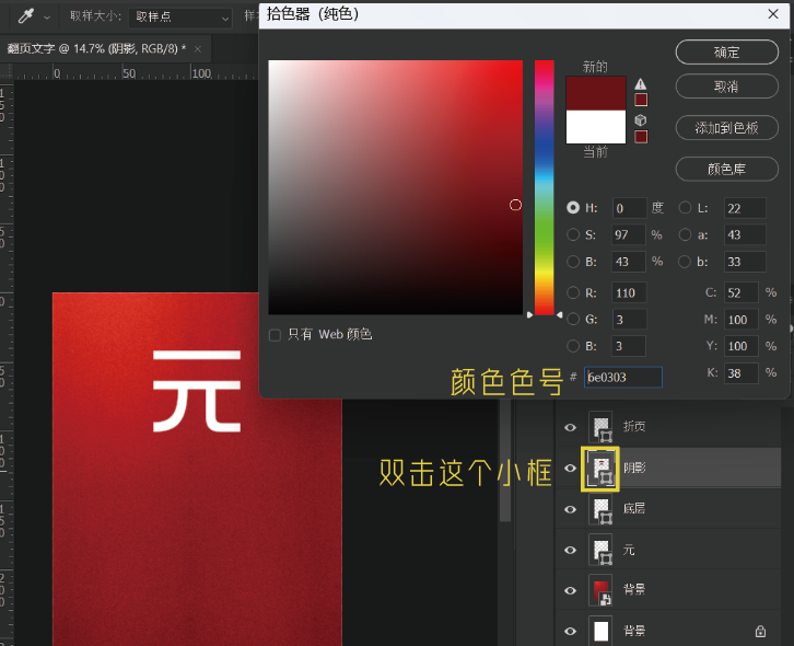 7.双击“阴影”的缩略图框,可以填充一个比背景更深的颜色(6e0303),阴影选择比背景深一点的颜色,阴影效果会更自然。
