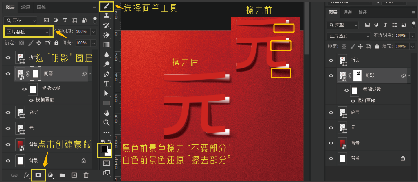 16. “阴影”混合模式改为“正片叠底”,为“阴影”创建蒙版。选择“画笔工具”,前景色设为黑色,用黑色画笔擦去多余部分。