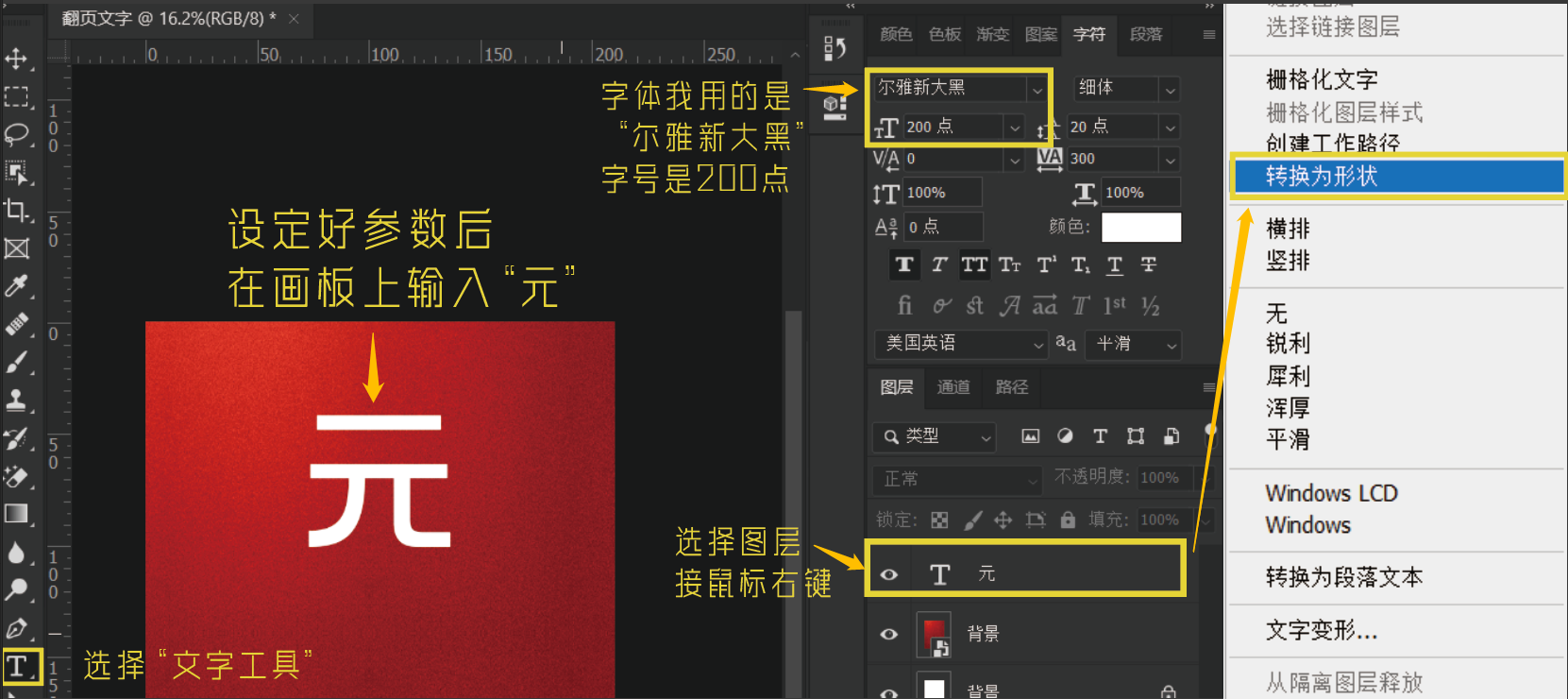 3.选择“文字工具”,字体选择“尔雅新大黑” 字号:200点,然后在画板上输入“元”。然后选择“元”图层,点击“鼠标右键”,选择“转换为形状后”(字体安装包在“评论区”可以免费领取)