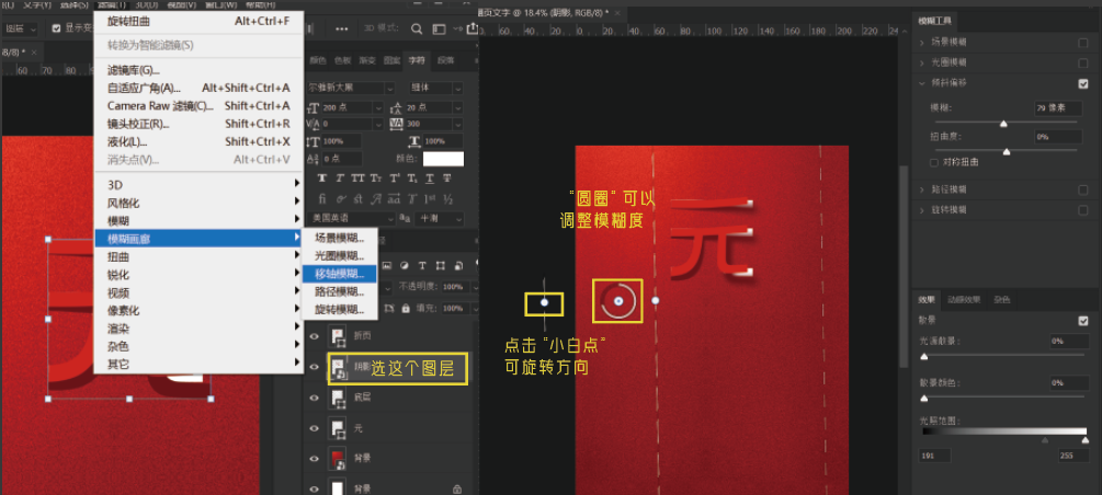 15. 选择“阴影”图层,执行“滤镜”,选择“模糊画廊”,选择“移轴模糊”,模糊度为79像素。