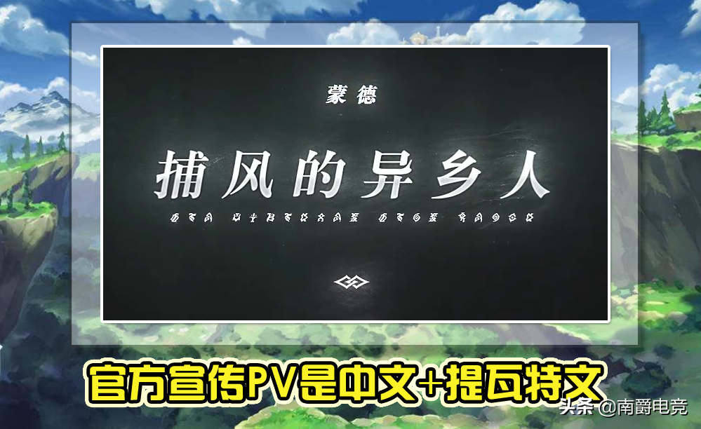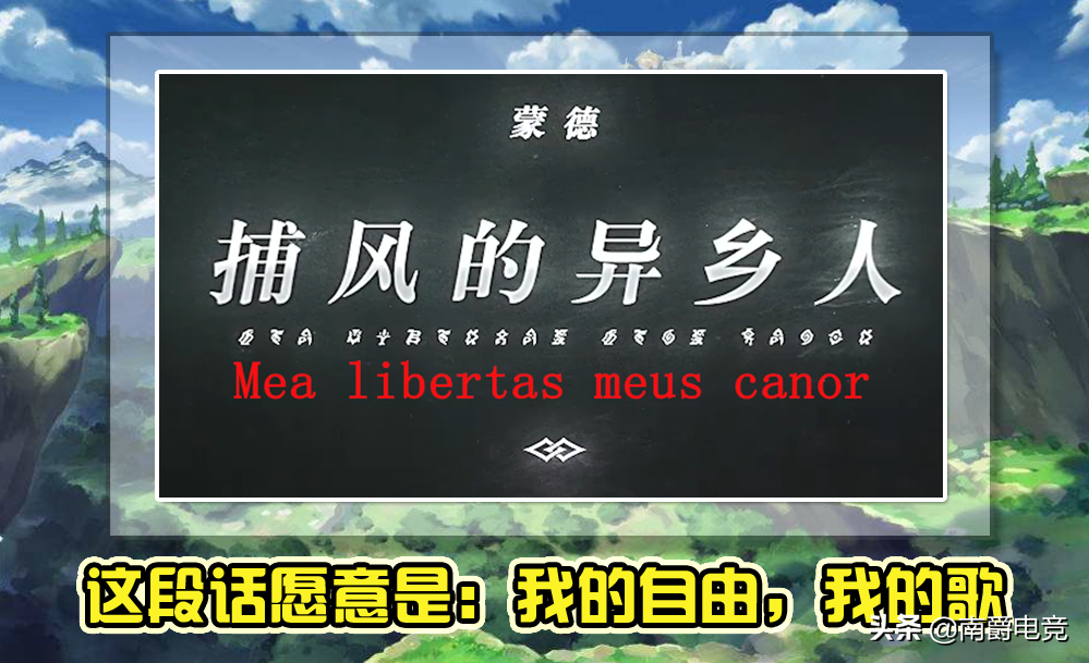 比如蒙德城PV的主题叫做捕风的异乡人,而下面提瓦特文转换成拉丁语就是:Mea libertas meus canor,这位大佬把这段话翻译为:我的自由,我的歌。熟悉温迪的玩家一看就知道,这段话说的就是温迪,他建立是蒙德是自由的城邦,他和其他七神不同,他让蒙德自由发展,而他自己则是化身成已逝好友的形象,以吟游诗人的形象在时间弹琴歌唱。