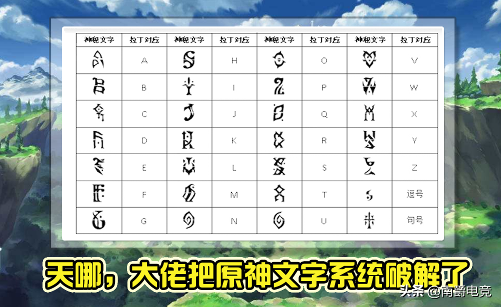 根据大佬自己介绍,他曾经学过三年的拉丁语和古希腊语,并且熟悉腓尼基文,居然还都是自学的!官方发布每个地区的宣传PV的时候,都有像上面这张图片一样的标题,大家可以看到,中文标题的下方是一小行游戏内的提瓦特文,这位大佬发现一些提瓦特文的形象和英文和腓尼基文有一些类似,之后研究发现,原神的提瓦特文使用的是拉丁语,然后把文字处理成了我们现在看到的蝌蚪文,最上面那张图就是大佬研究得出的对照表。