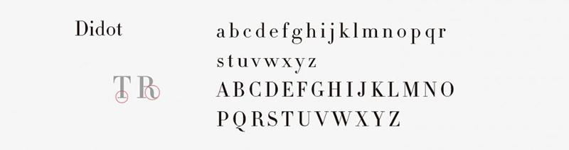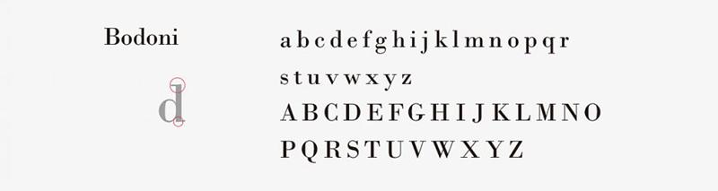 与Didot类似,同属于现代型衬线体,粗细对比强烈,部分字体衬线比Didot多了一些变化,如小写字母的d的上升部衬线,这款字体被称为现代主主风格最完美体现。