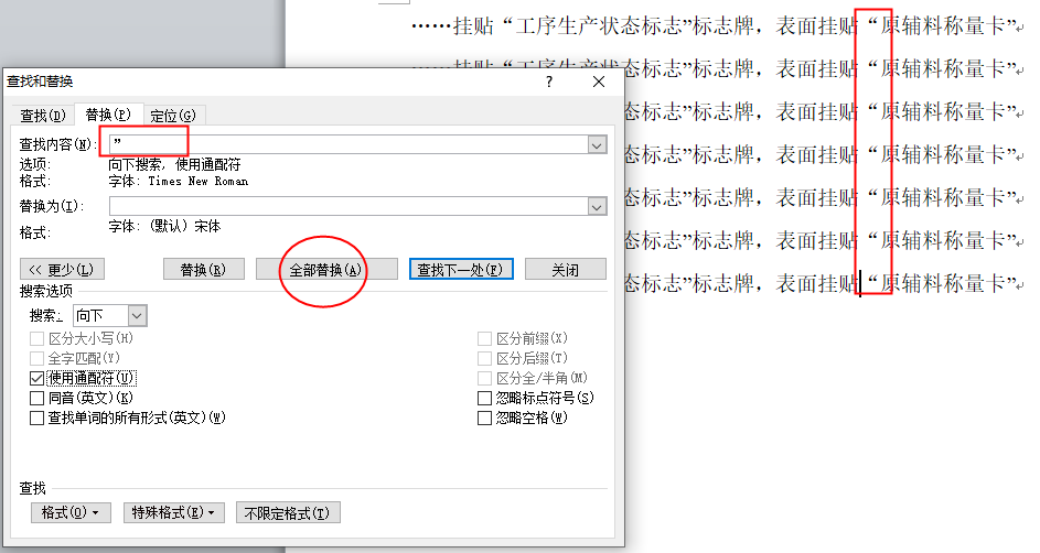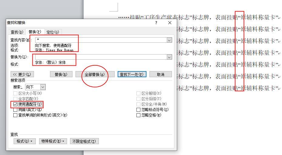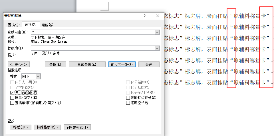 2、复制文档中的左双引号,粘贴至查找内容(也可直接输入宋体下的左双引号),选择更多,勾选“使用通配符 ”,在左下角格式→字体中将西文字体选择为Times New Roman 。