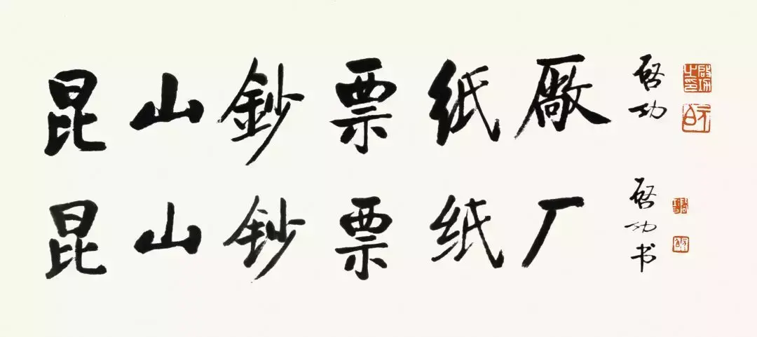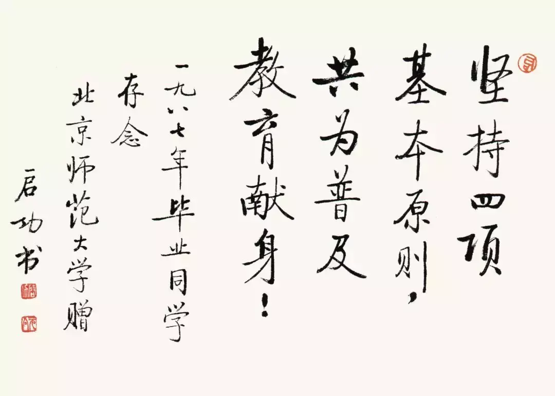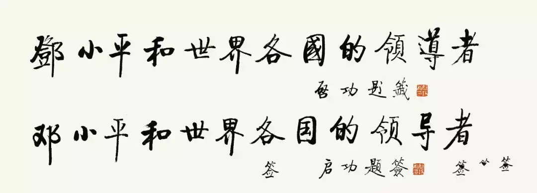 自从北大方正字库中有了启体字,经常可以看到用启体字制作的字形优美、俊秀挺拔的牌匾或创意广告,也有用启体字书写的诗词、文稿,甚至电视、报刊上亦用启体字作节目宣传,启体字已被大家广泛运用。但是,有人认为用方正字库里的启体字做的牌匾体现不出启功先生书法的风格和神韵,比较单薄,还是希望用启功先生亲自书写的字制作匾额和招牌。经与先生商议,先生提出可以在他已经写过的字中选出合适的字,集成牌匾或书签,经他本人审阅同意后可以使用。这件事便委托北京师范大学出版社代他办理,笔者曾向先生建议,由北师大出版社从先生的作品中,按照国务院颁布的规范字集一套字库,以备随时选用。先生说:“好啊!北大方正的启体字库可叫‘秦书启体’,你们从我的字中集的可叫‘启书启体’,你们找不齐,我可以给你们补写。”遗憾的是这套“启书启体”直到先生逝世也没有集全,随着先生未发表的作品逐渐被发现,我们将努力完善这套字库,作为对先生的纪念。