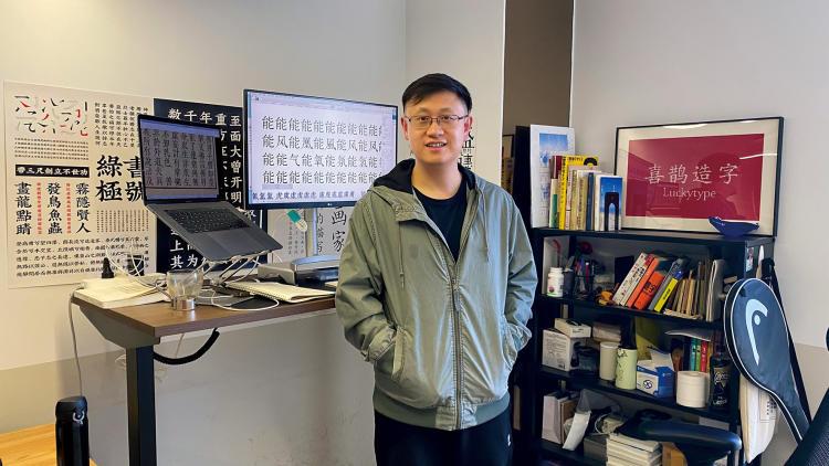 到达叶天宇的工作室时,我远远看到门半掩着,玄关处的整面白墙上,深红色的“喜鹊造字”logo透露着高级感。叶天宇站在靠窗的工位前,电脑大屏上的汉字不断切换着,一撇一捺在他的控制下伸长或缩短,充满趣味。