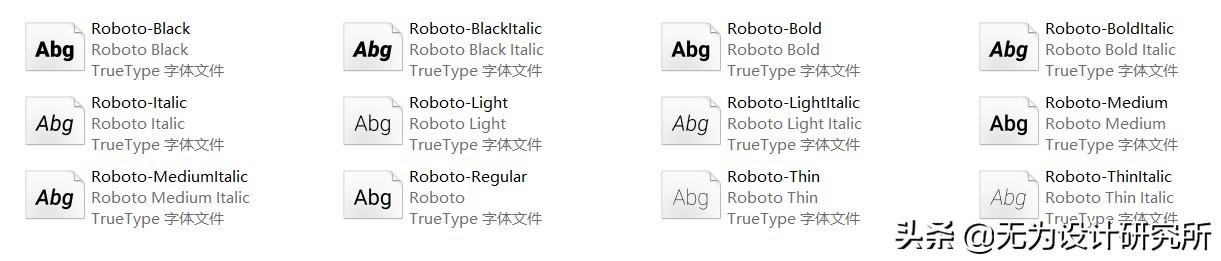 想要得到与 Helvetica 相同的排版效果,我们可以选择另一款替代字体 Roboto。Roboto 也是一款具有现代感的无衬线字体,字形风格非常接近 Helvetica。一共有 12 款字形,免费可商用。
