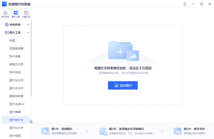 打开首页在左侧找到“图片文字”功能,然后上传带有文字的图片,接着可以在右侧选择输出格式,支持输出保存为Word、TXT文档、纯文本、Excel文档,根据需求选择对应的输出保存格式,然后点击立即识别,识别后会单独保存为文档格式。