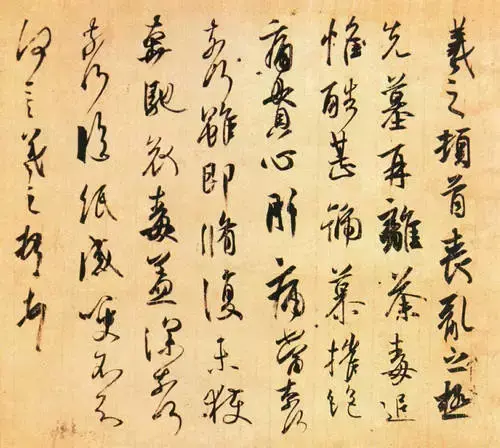《丧乱帖》:“羲之顿首:丧乱之极,先墓再离荼毒,追惟酷甚,号慕摧绝,痛贯心肝,痛当奈何奈何!虽即修复,未获奔驰,哀毒益深,奈何奈何!临纸感哽,不知何言。羲之顿首顿首。”